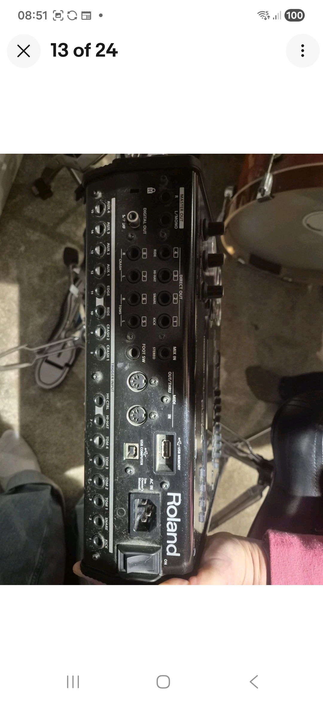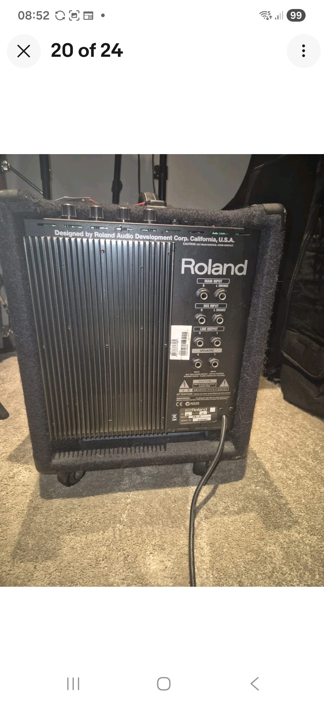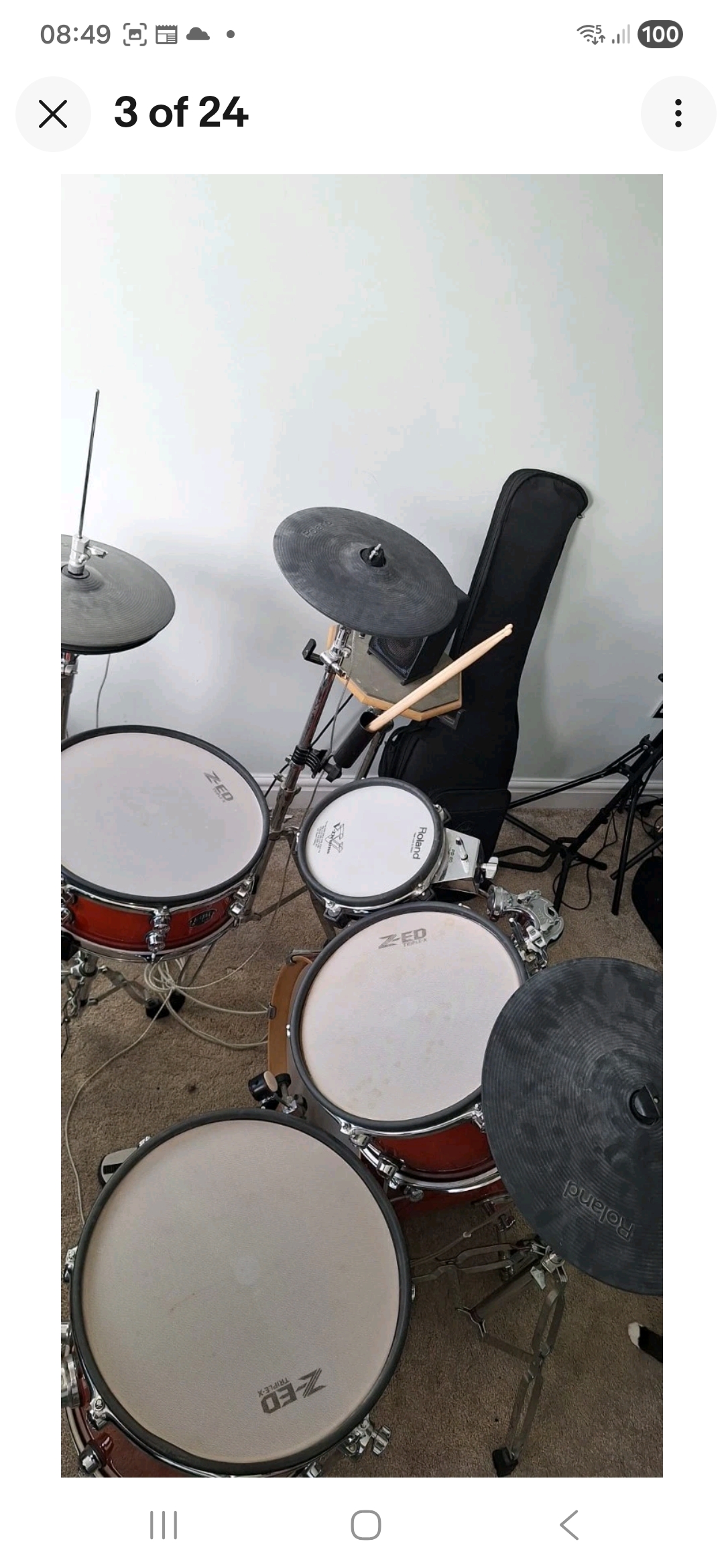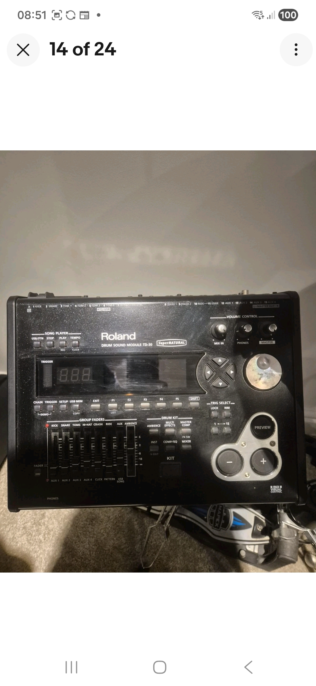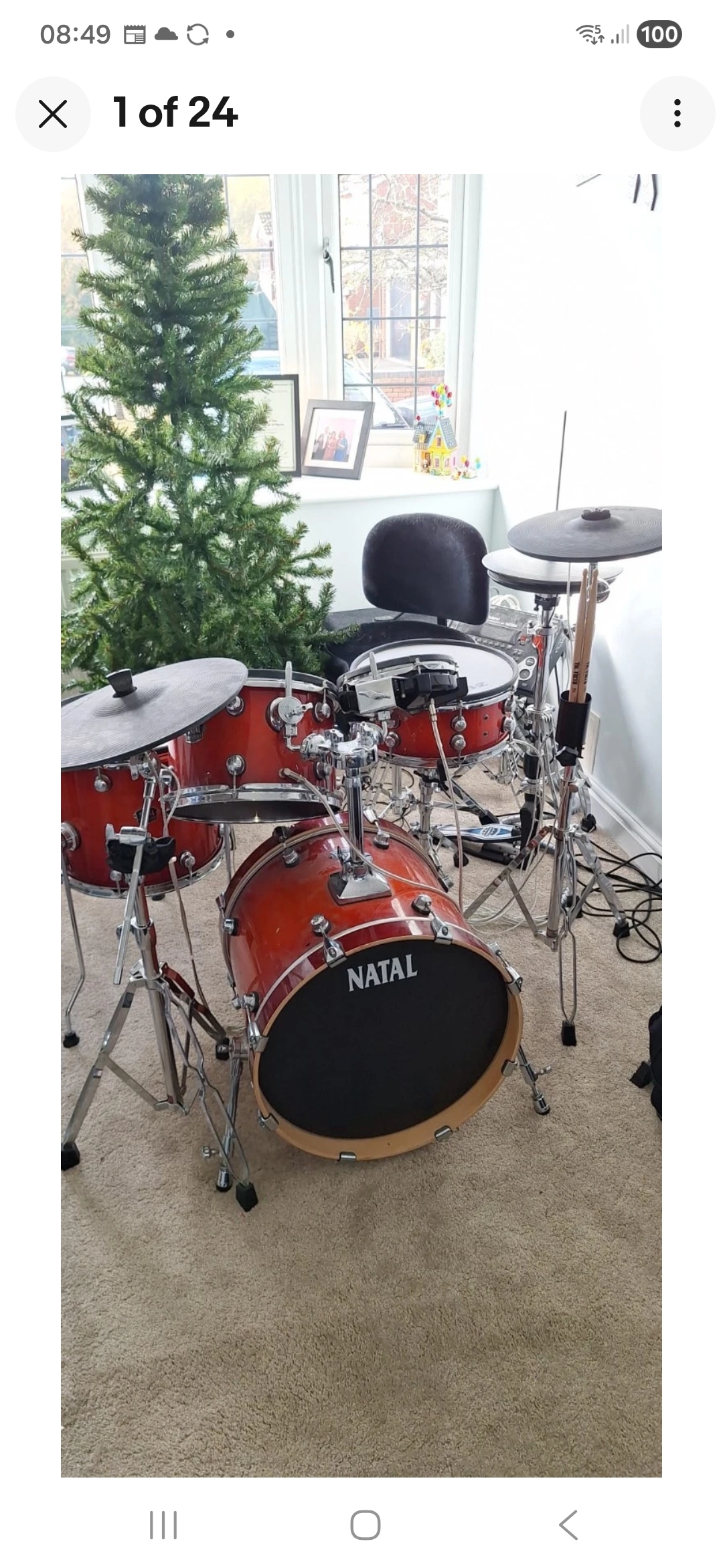 Acoustic Natal Drum Kit converted into Electric. Comes with Kick and Pedal, Snare, Tom 1 (Roland drum, not natal), Tom 2, Tom 3, Hi hat and Pedal, Crash and Ride. 2 Roland L and R speakers mostly for treble. Roland PM-3 mostly for the bass and mids. Comes with Cables, an extra pad which can be assigned a sound using the module. Also comes with a practice mat to practice rhythms and technique. The module is a Roland TD-30, selling for around £700 online just for the module. The skin heads on the drums have some marks and stains on them but work fine. They could always be replaced if you really wanted to. We have more pictures if you need any