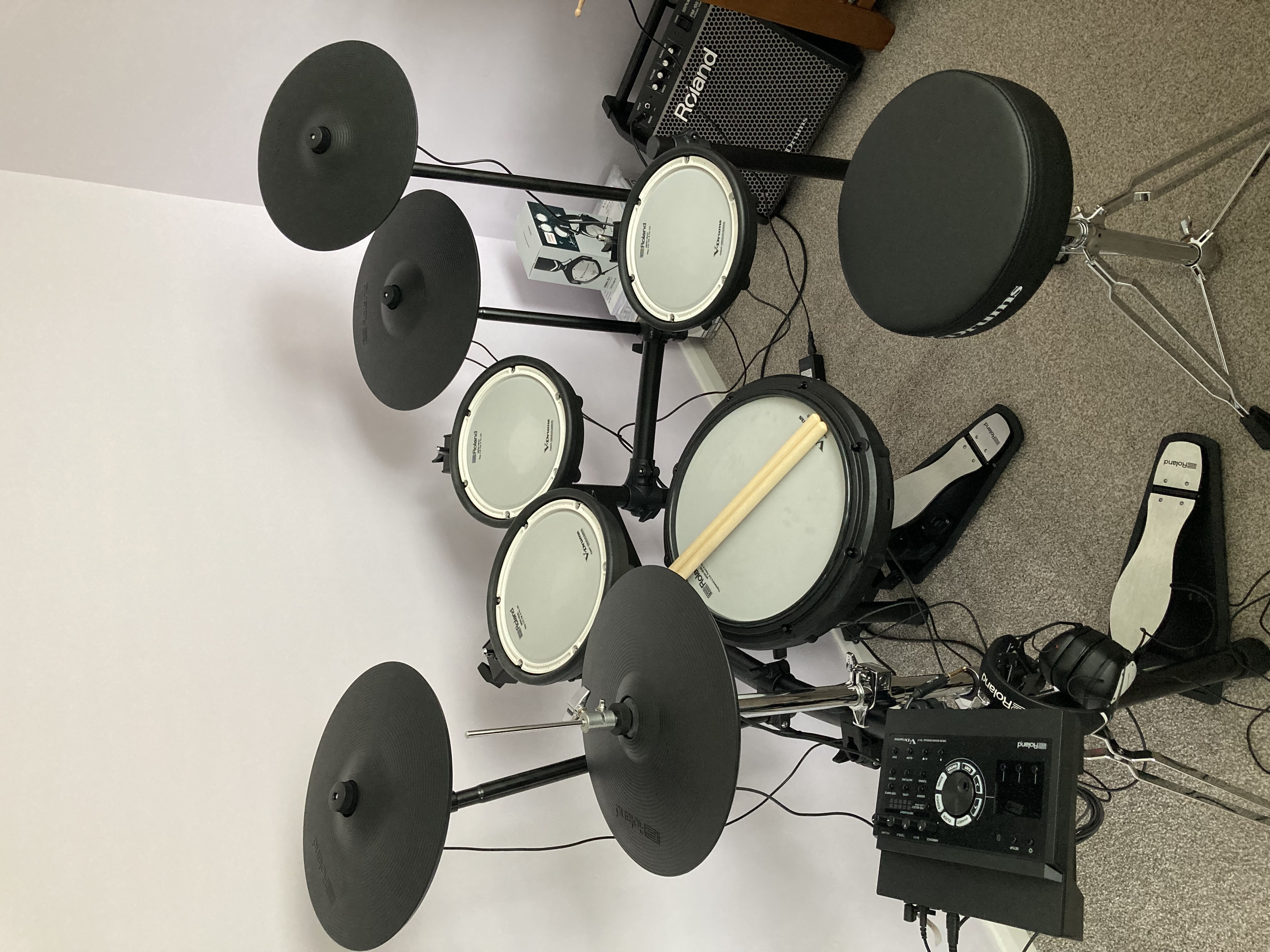 Roland TD-17KVX2 purchased October 2024 for my Sons 10th birthday but now available for sale as he has lost interest! Has never left our house and rarely played. Roland VMH-D1 headphones and PM-100 amp also available at additional price.