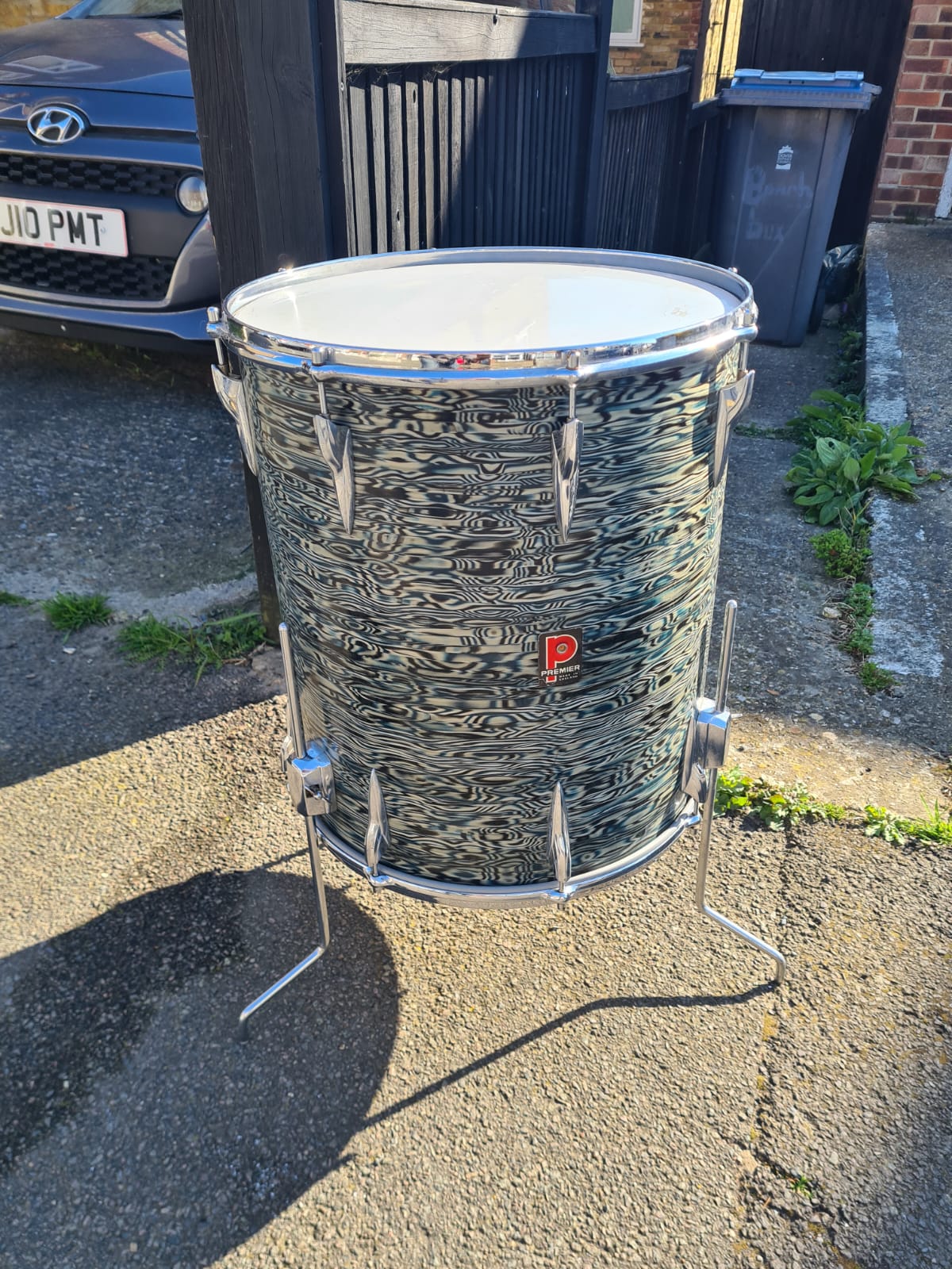 A vintage Oyster Floor 16 inch deep (19inch) floor tom. I have had it since the mid 1970s - and it was second hand then, so this may have been made in the 60s. It is in very good, almost excellent condition. The Oyster covering is slightly in one part at the seam (see photo). Chrome is very good, with some scratches but no rust. Hard case included.